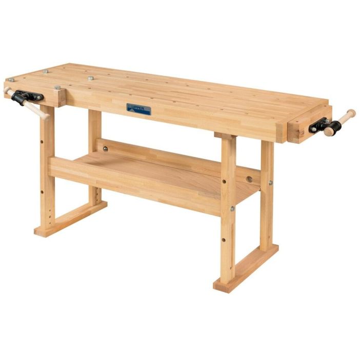 - Diese Hobelbank wird in der Breite 1700 mm geliefert und ist aus keilgezinktem Buchenleimholz gefertigt. Sie wird sowohl von Profis als auch von Bastlern oder Gelegenheitssschreinern bzw. -schnitzern hoch geschätzt. Zur Aufbewahrung von Werkzeugen oder Materialstücken dient ein offenes Fach. Zwei Reihen von Löchern ermöglichen die Spannung einer unbegrenzten Auswahl an Werkstücken. Im Fußgestell der Hobelbank sind weitere Löcher gebohrt, die in Verbindung mit der Spannzange die vertikale Befestigung der Werkstücke ermöglichen. Auf der Hobelbankplatte sind in zwei Reihen weitere Löcher angeordnet, die die Befestigung von verschiedensten Werkstücken ermöglichen.