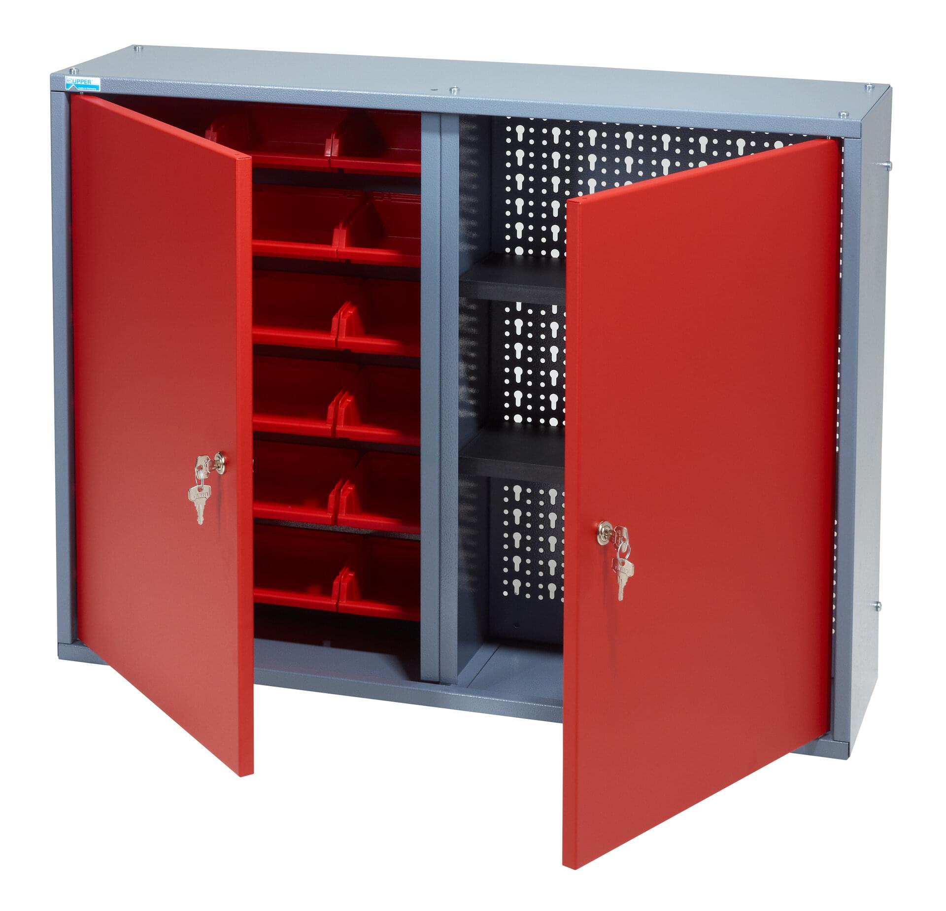 Die Küpper Hängeschränke werden aus 1mm Stahlblech gefertigt. Die Ausstattung ist variabel und die Modelle sind mit Lochrückwänden ausgestattet. (zum Einsatz aller Küpper Systemhalter) oder Schlitzpaneele (zum Einhängen der Küpper Sichtboxen) Die Fachböden sind jederzeit verstellbar und haben eine Tragkraft von min. 5 kg pro Boden (verteilte Last)