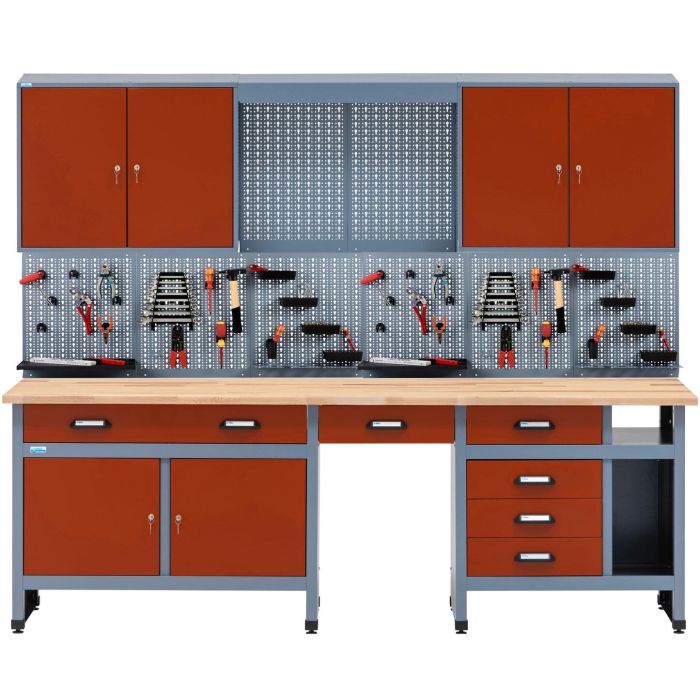 • con le dimensioni 240 x 60 x 84 cm, 6 cassetti, 2 ante 2 parete traforate 3 pz. 70100, 120 x 60 cm, incl. ogni 12 ganci standard Armadietto pensile 70180, 240 x 60 x 19 cm, 4 ante, 4 mensole, 36 contenitori a vista esclusi attrezzi illustrati e decorazione!